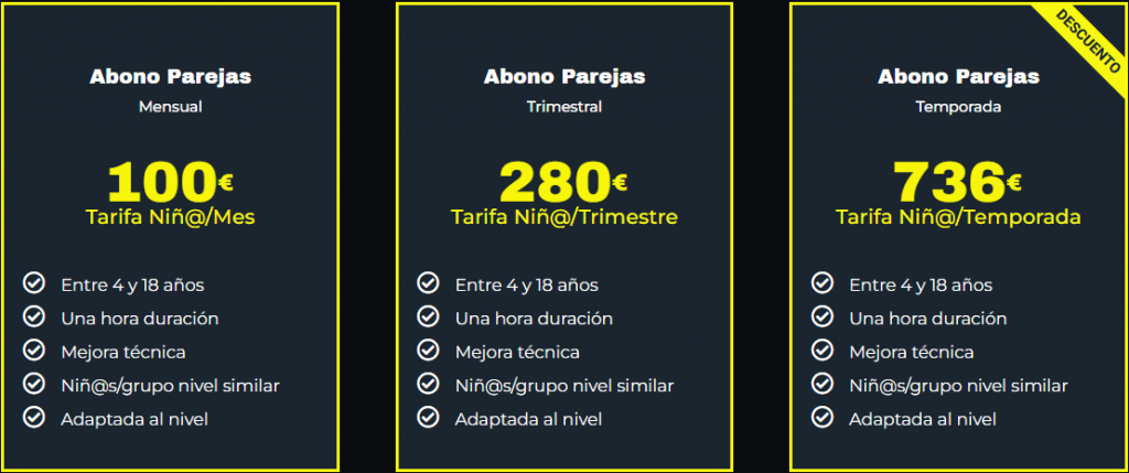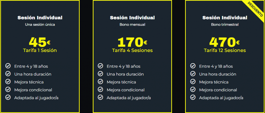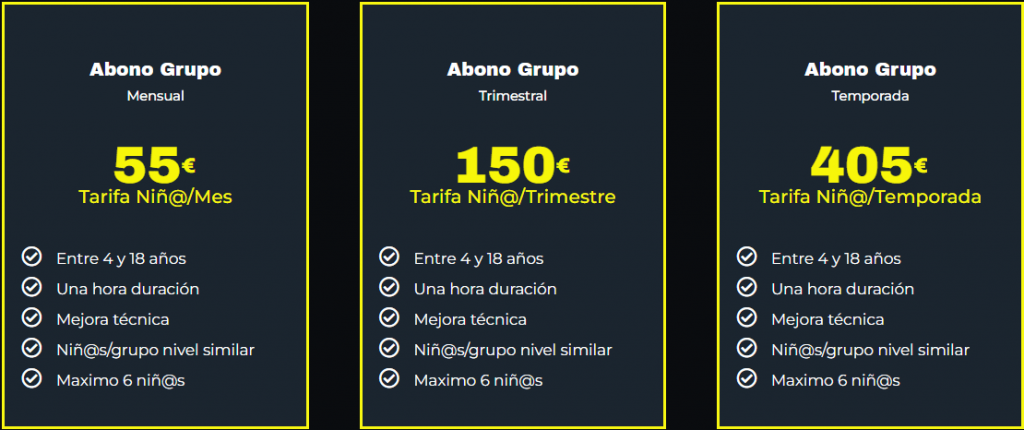 Ofrecemos diversos planes con bonos mensuales o trimestrales que incluyen opciones para asistir a una o dos sesiones por semana, adaptados a diferentes niveles. Gastos de matriculación de 45€/niño que incluyen también toda la equipación de entrenamiento (camiseta, pantalón, calcetín y sudadera). y seguro deportivo. Consulte descuentos para colectivos, clubes y segundo hermano. En todos nuestrois bonos es imprescindible mantener estable el dia y hora de la clase semanal (si no es asi no se garantiza hora dsiponible). Sesiones perdidas sin previo aviso de 72 horas no se recuperan.
